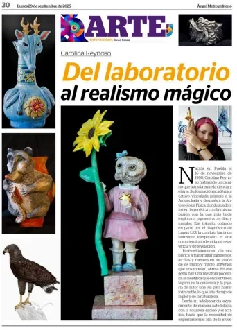 El diario Ángel Metropolitano publicó el 25 de septiembre de 2025 un artículo dedicado al trabajo de la artista Carolina Reynoso, titulado “Del laboratorio al realismo mágico”, en el que se presenta una mirada cercana a su trayectoria, proceso creativo y universo visual.
